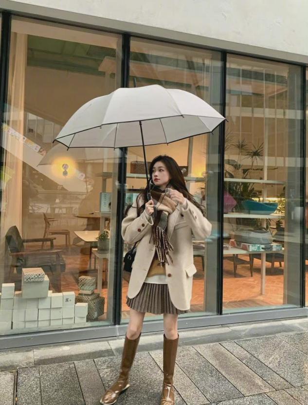 并不是说一身服装采用了非常单调的搭配,这时加围巾就会显得多么出彩,也需要合适的内搭展示。平时围巾的打结方式有不同风格,有时髦的个性打法,也有很复古的平淡打法,甚至还会有一些偏向于帅气的中性类打法。这时就需要和里边内搭进行合理的设计。她在里边选择了层次搭,毛衣配白色内搭以及百褶裙的设计,是减龄且甜美的效果,加浅色外套,赢得了气场也有简洁的感觉。