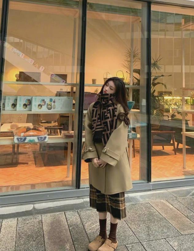 深色或大地色的服装与冬季会比较相配,但在选择比较宽松的中长毛呢外套时,女生可以在下身搭配格子半身裙,露出脚踝或小腿。这时可能会因为毛呢外套偏向于厚重,所以在选择鞋子时单薄款或清爽款会更显青春,在搭配这种复古类服装时,女生选择的围巾也应该用同样的色彩。