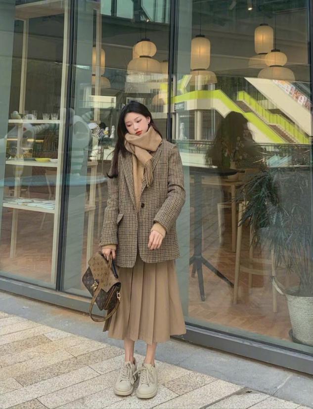 格子西装是一种趋向于平淡的复古类造型,这样的服装往往很难穿出青春范儿,那么我们可以通过内搭的版型来凹造型,她在里边选择简约内搭,配上中长A版百褶半身裙,就像是设计比较宽松的校服,洋溢出青春魅力。