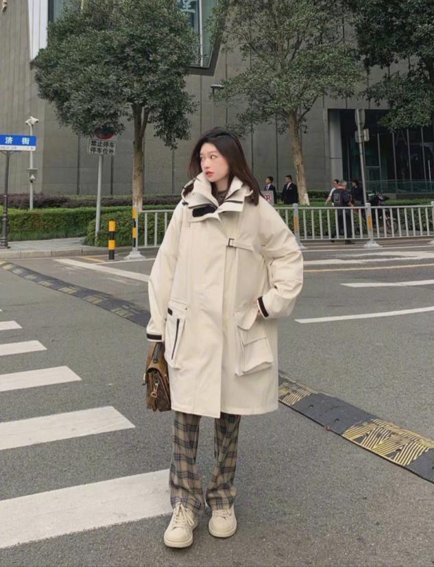 平时在选择中长外套的时候,女生会在下身选择一条修身的打底裤,这样腿部纤细的线条就会被显现出来,但这种穿搭似乎太过平淡,如今女生会在下身选择一条长裤,这时如果配有了非常酷帅的风衣式或工装式外套,那么可以采用深色格子裤配老爹鞋或小白鞋。