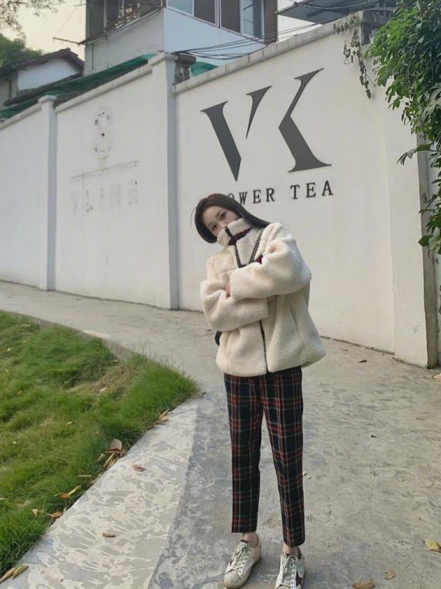 格子裤虽然没有格子上衣那样更趋向于复古感,但格子裤却是一种并不好穿的服装,它需要女生经过精细的搭配才能凹出时尚魅力,这种黑色为底色上面加入红色格子的裤子是非常复古的版型。她在上身选择短绒羊羔毛外套,起到了中合作用,显出阳光清纯感。