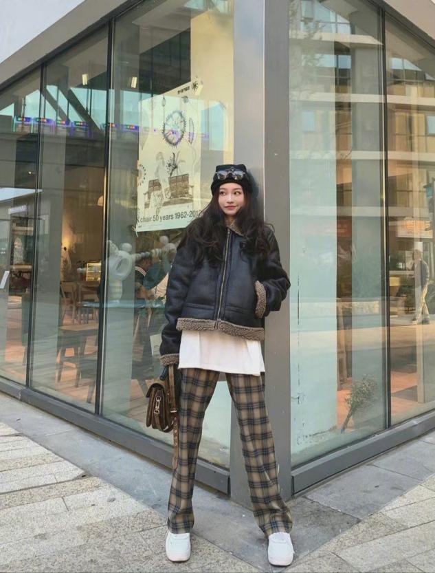 她在里边选择白色T恤,下身搭配修长格子长裤配上白色运动鞋,是非常清纯阳光的学生妹穿搭展示,这时可以在上身选择比较清爽的复古针织马甲,又或者像她这样搭配一件深色短款皮外套。