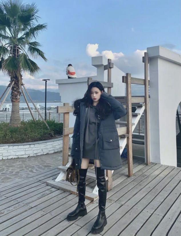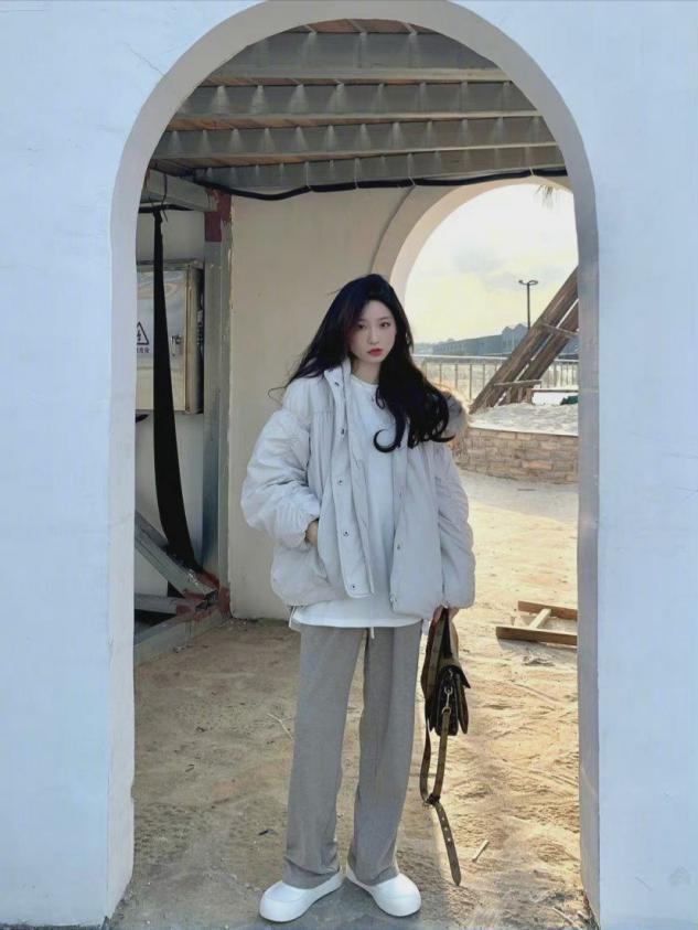 比较厚重的棉服类派克服设计是一种既保暖又显清纯的服装,韩系时尚小姐姐在里边选择简约内搭配上一款直筒型长裤,看似平淡,却是充满时尚感的简约女神风造型。